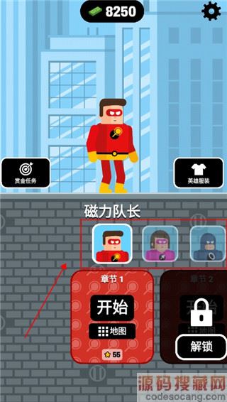 1、滑动此处可以选择你喜欢的超级英雄来挑战关卡