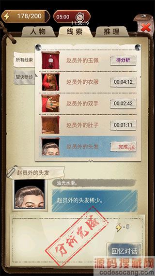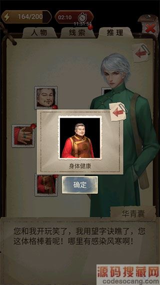 3、游戏过程中,主要人物的篇幅很大,尤其是刚开场的华青囊,由于信息较多,基本都是配音员念台词,信息展现方面主要以读角色心理+台词为主,感觉比较单调。在触发第一个可调查NPC时,系统会说明游戏线索、推理等模块功能,这方面的信息说明也是在对话框中展示的,不仅篇幅略长,而且并无配音,只能通过观看文字的方式了解。