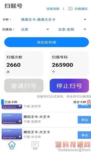 2、选择归属地,扫号即可,扫号后,到结果页面查看号码。