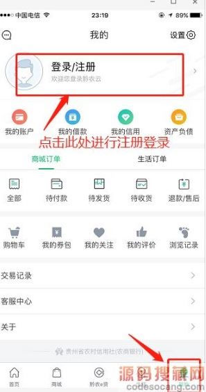 1、打开贵州农村信用社手机银行app,点击右下角“我的”,点击上方“登录/注册”进行注册账号并登录。