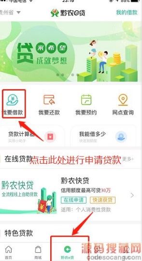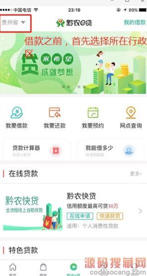 2、登录成功之后,回到“黔农e贷”页面,现在左上角选择行政区,然后点击“我要借款”。