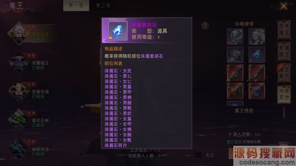 神魔禁地掉落为个人归属,击杀该地图下魔王和精英怪物均会增加怒气,怒气满100将会被逐出副本,场景内每1分钟自动增加1点怒气,死亡会增加20怒气。神魔禁地魔王主要产出套装石,而精英怪物则产出套装石碎片,可通过合成,获得套装石。