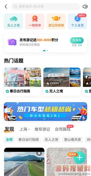 2、切换到【自驾游】页面之后,我们还能看到各种自驾出行功能,下方还会显示其他用户分享的自驾心得。