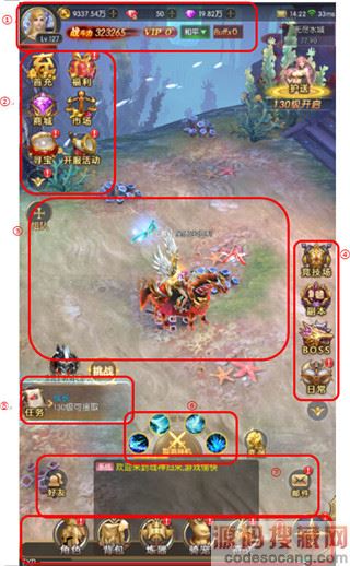 1:玩家信息区,包括玩家等级、血量、战力、金钱、钻石数据等;