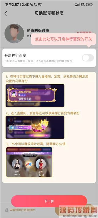 9、点击切换,开启以后进入直播间发言送礼都不会展示你的真实身份,还能享受专属装扮;