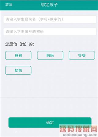 2)再点击【绑定孩子】,输入孩子的登录名和密码等点击【确定】即可。(如下图)