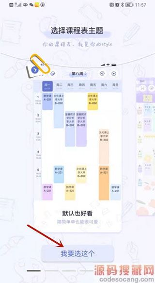 2、在新页面,左右滑动,可进行课程表主题选择,选择后,点击“我要选这个”进入新页面