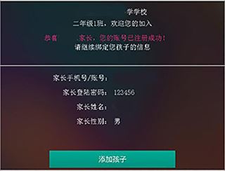 4、家长帐号即可注册成功,接着点击添加孩子(注册孩子帐号)。输入孩子姓名、性别、与孩子关系,设置孩子帐号密码,确认密码。点击确定,孩子帐号即注册成功,孩子帐号一般是s+家长的手机号。