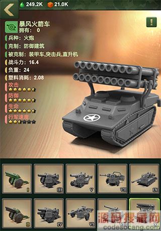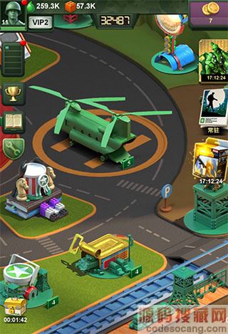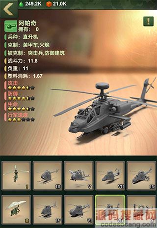 3、直升机工厂:训练直升机的地方,升级直升机工厂,根据等级,可以训练更多种类的直升机,有隐形直升机、阿帕奇、鱼鹰炮艇机、多用途直升机、特种攻击机等多种类直升机;直升机克制装甲车和火炮,同时被突击兵和防御类建筑所克制。