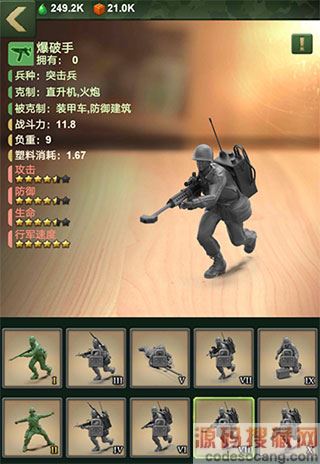 2、突击营:训练各类突击兵的地方,突击兵以持续输出为特点;升级兵营,可以训练更多种类的突击兵,有陆战队、空降兵、侦察兵、爆破手、战场特工、冲锋队等突击类士兵;突击营克制直升机和火炮,同时也被装甲车、和防御建筑所克制。