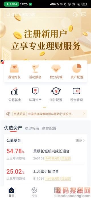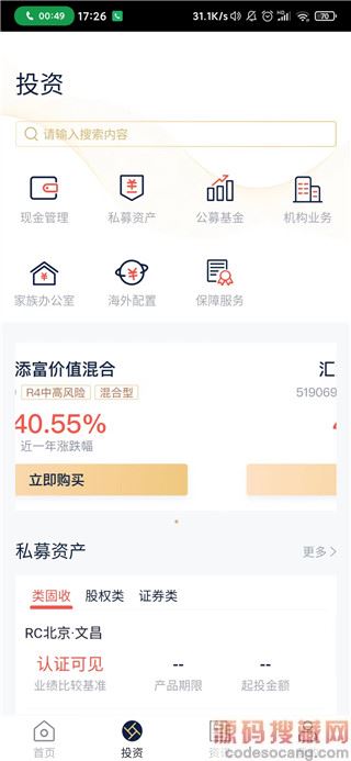 3、如果又想要搜索或者是查看更多理财茶产品就可以点击投资选项了;