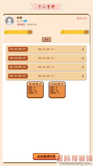 7、【个人资料】:点开此界面就可以查看自己的各项数据,里面记录了玩家各个模式的通关数据和最佳成绩,而且玩家在登录之后还能获得更好的游戏体验。