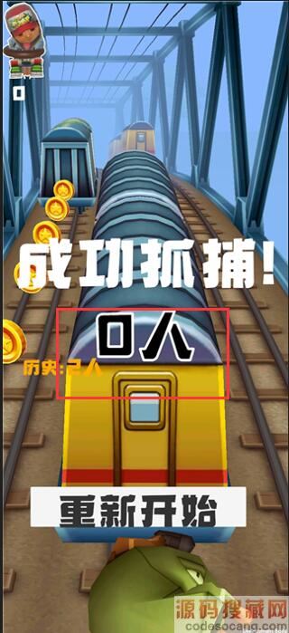 5、碰到障碍物或者是碰到地铁会死亡,屏幕中将显示你的抓捕人数以及历史人数;