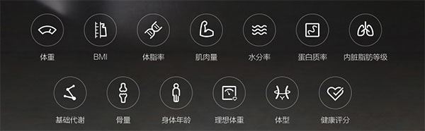 高精准BIA测脂芯片,一次称重可知晓体重、BMI、体脂率、肌肉量、水分率、蛋白质率、内脏脂肪等级、基础代谢等13项身体数据,全面了解身体健康状况。