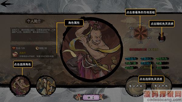 玩家开局可以选择使用的角色、和对应的先天资质,点击左下角角色头像可以刷新资质列表。