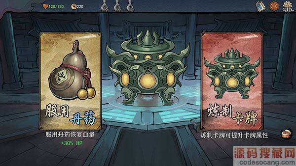 丹炉图标代表的是炼丹,通俗点来说就是休息处,你可以选择恢复血量或者强化卡牌。