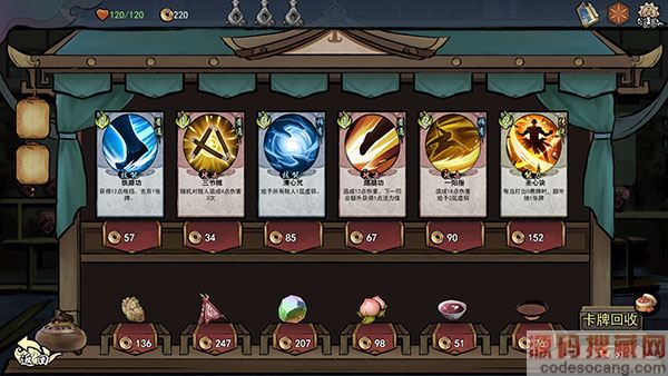 算盘图标代表的是商贩,你可以在这消耗金币购买卡牌、法宝、丹药或者回收卡牌。