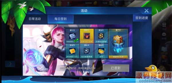 2、第二:每天签到,没签到五天就可以获得砖石轮盘徽章,而这些徽章可以免费在钻石轮盘抽取奖励,里面就有各种皮肤和碎片奖励;
