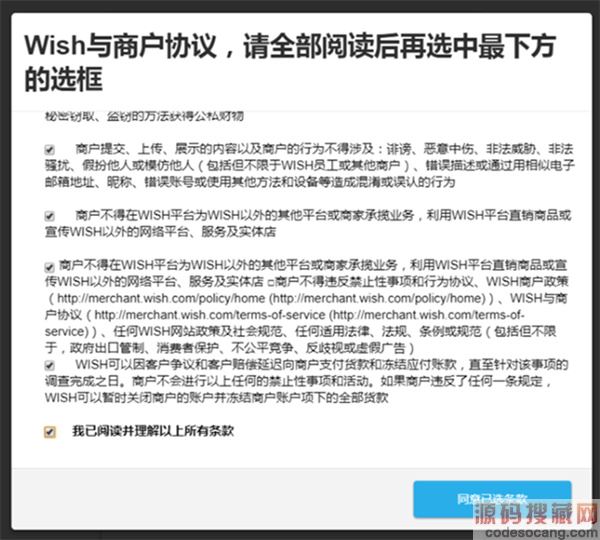 请阅读Wish商户协议,并在全部阅读完后点击最下方的选框。