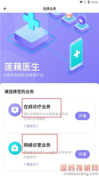 2、用户可以根据自己的情况选择在线诊疗业务或者网络诊室业务进行开通。
