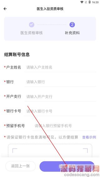 3、点击进入页面后首页用户需要填写医生入驻资质审核,上传身份证、医师资格证等照片。