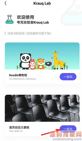 2、通过Krauq Lab的页面里,我们就可以找到“首页自定义壁纸”功能,点击其中“一起玩”按钮就能够更换皮肤了;