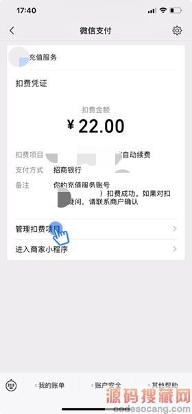 1、在微信支付公众号中,找到相关项目的扣费凭证通知,点击【管理扣费项目】。