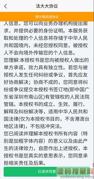 2、接着我们会看到一份法大大协议书,需要下滑至协议的最下面才能看到“已读并同意”的按钮,我们再点击这个按钮进入下一步。