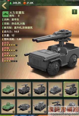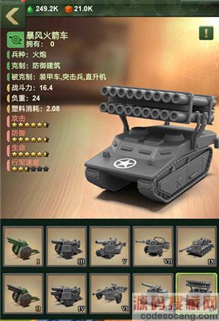 坦克工厂:训练装甲车的地方,升级工厂,根据工厂的等级,有中型坦克、防空坦克、冲锋战车、火力支援车、主战坦克等多款坦克来提升自己的实力;