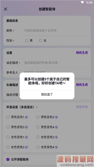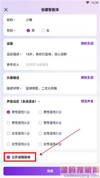 3、在这里依次进行名字、性别、背景性格等设定,还有声音可以选择,然后选择是否公开这个智能体,公开则是所有用户都可以看到这个智能体,并能与它进行聊天,设置好后点击下方的【完成】。