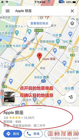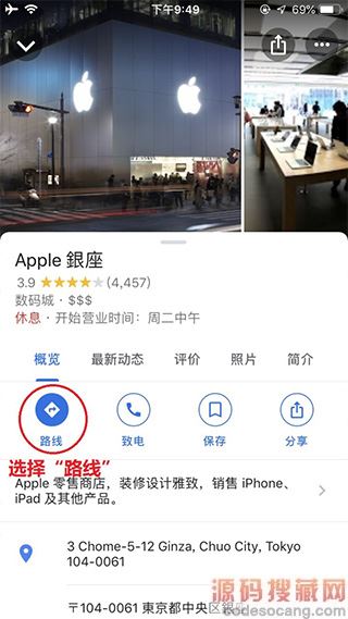 4、确认完目的地详情后选择“路线”,这里的目的地详情有非常多的实用情报例如营业时间、电话、主页、照片、店铺评价等,且基本都自动翻译成中文,非常方便!