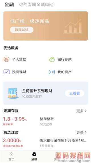3、在“金融”页面,也有优选服务,如:个人贷款、银行存款、投资理财等;