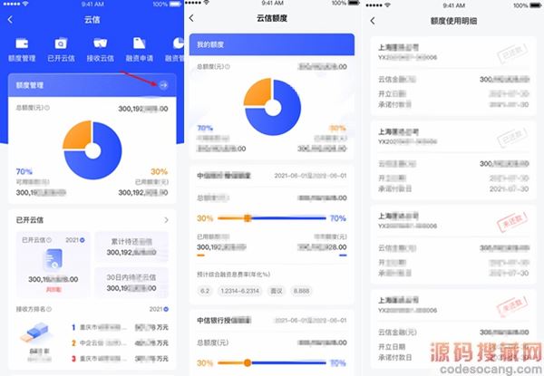 核心企业可查看云信额度的构成、额度明细、其中额度明细中可查看额度的有效期、可用额度、以及额度投资方案对应的息费率,及额度使用明细。