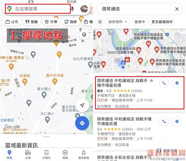 步骤一:我们打开手机内的「Google地图」App,在搜寻框输入地点,并直接点开。