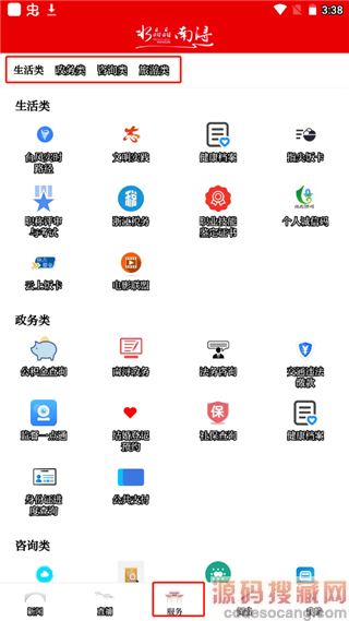 3、点击服务,里面提供生活类、政务类、咨询类、旅游类等等方面的服务;