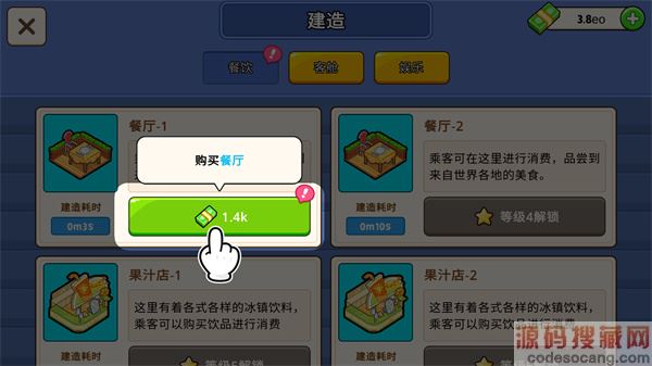 2、拥有足够多的货币后,点击建造即可建造餐饮、客舱以及各种娱乐设施,注意有些建造需要达到相应的等级要求。