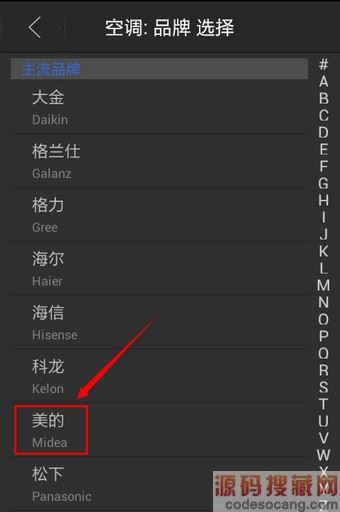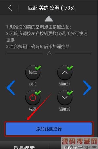 打开添加遥控器,依次点选家电型号、品牌,再对遥控按键逐个匹配,成功后即可添加此款家电的遥控器,下面以美的空调为例进行说明。
