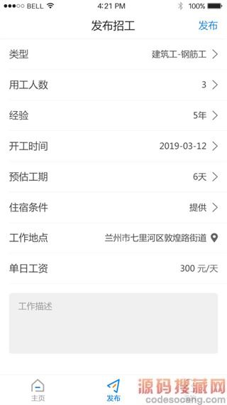 2、发布招工信息。选择招工种类,可以是建筑工人、维修工人、安装工人、装修工人、小工等类型。选择自己需要的类型确定,然后填写所需要人数、工作经验限制、施工地点、开工时间、每天工资等招工信息,完成后点击发布。