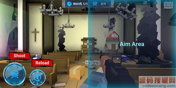 2、进入关卡后,拖动右侧屏幕可以移动准星,左侧为开火和换弹按钮。
