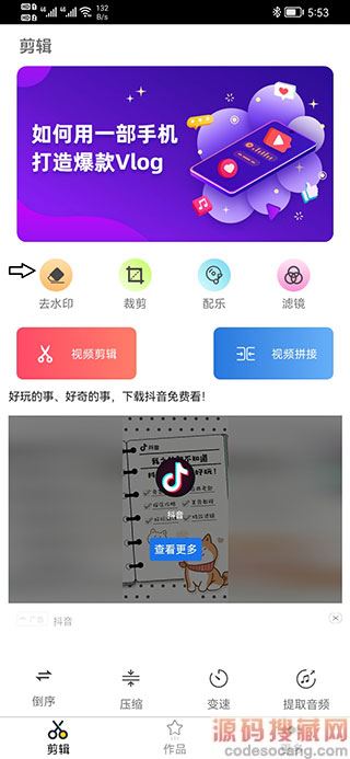 1、打开软件,进入首页如图所示,点击去水印,进行下一步。
