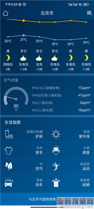2、还为广大用户提供了空气质量检测,穿衣、洗车、紫外线等生活指数;