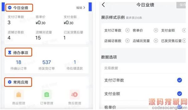 2、在“首页页面”上可以查看“今日业绩”、“待办事项”、“常用应用”三个板块。其中,“今日业绩”具体涵盖支付数据、售后数据、店铺数据、财务数据,又可细分为“支付订单数”、“支付金额”、“店铺访客数”、“已发货售后量”等细分的数据指标,商家还可以根据个人需求对显示的数据字段进行调整。