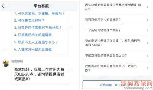 4、“我的”页面主要包括“我的客服”、“商家中心”、“设置”三个功能模块。其中,“我的客服”旨在为商家提供平台客服服务,解决商家在日常店铺运营中遇到的问题。商家有任何店铺经营问题都可以点击“我的客服”进行提问,平台客服会在8:00-20:00进行回复。点击“商家中心”可以直接进入“帮助中心”模块,商家可针对商家营销、推广拓流、关店等问题进行针对性搜索,以自助获取相应内容帮助。