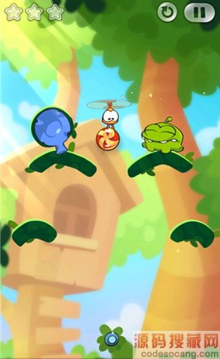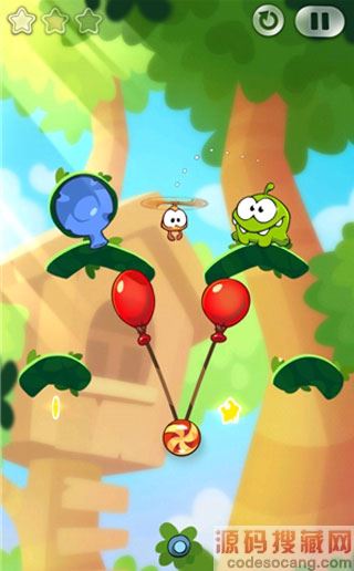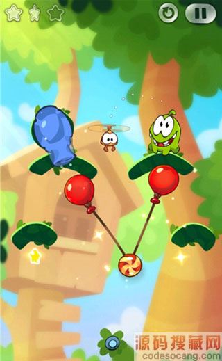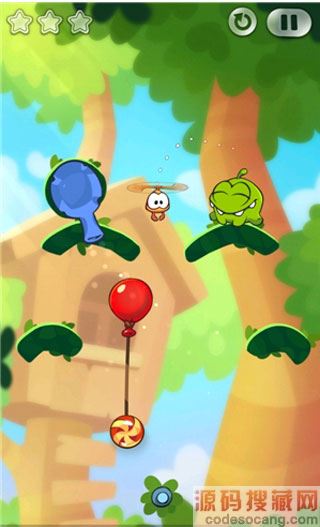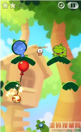 6、当Roto拿到糖果时点破气球,Roto带着糖果向右移动,正好落入怪物的嘴里。
