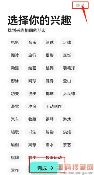 5、最后选择自己的兴趣,以便软件根据兴趣推荐好友,点击完成即可进入使用。如果不想选择兴趣,可点击右上角跳过。