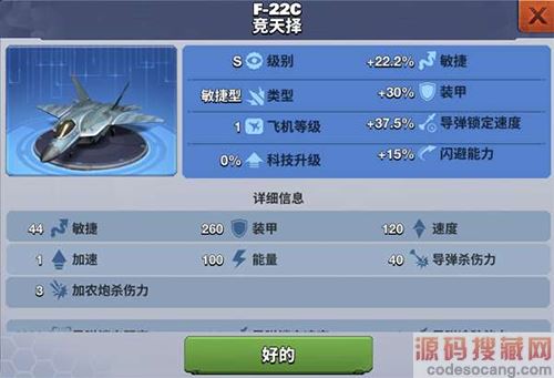 新手想要在游戏当中快人一步,空战争锋攻略是一定要知道的。事实上,在游戏当中,F-22C竞天择是当今世界上最先进的战斗机,在游戏里面,玩家的勋章在达到了2000的时候,就可以对该飞机进行解锁了,当然了,玩家也是需要花费掉4800钻石才能够获得它的。F-22C竞天择属于敏捷型飞机,其锁定速度也是很快的,闪避能力很强,敏捷性也很高,它将会是一款未来的1V1神器。