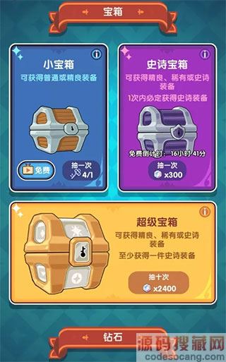 游戏中,冒险者们的装备来自于三大途径。第一,通关关卡随机掉落获得;第二,通过挂机系统概率获取;第三,通过商店宝箱抽取。前两种方式无需多说,这里稍微说下关于商店的宝箱。商店宝箱能开出装备的包括小宝箱、史诗宝箱、金色宝箱。