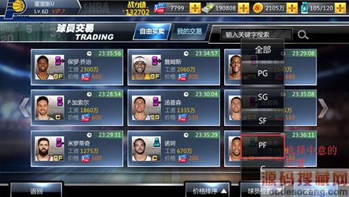 3、不要着急,在这些备选中我们首先根据自己的球队阵容来引进优质球员,比如我就非常想要一个S品质的PF,可以用筛选找出现在市场上挂售的中锋有哪些。