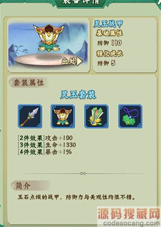 目前游戏蓝色装备只有灵玉套装,分为4件套,凑齐复数套装后会有相对应的套装属性,灵玉神枪作为攻击类武器而且与多数葫芦娃有着缘分效果加成,推荐作为前期过度所使用的主要攻击武器。