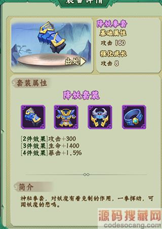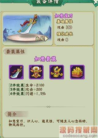 1、游戏内的紫色装备主要分为降妖套装和如意套装,分别对应游戏内的输出类角色和坦克类角色的装备,输出类角色推荐使用降妖套装,坦克类角色推荐使用如意套装,如意宝刀作为所有坦克类葫芦娃的缘分武器(小金刚除外),多使用并且强化可以更好地强化自身属性以及战力,降妖套装主要提升的则是输出,推荐给后排葫芦娃使用。